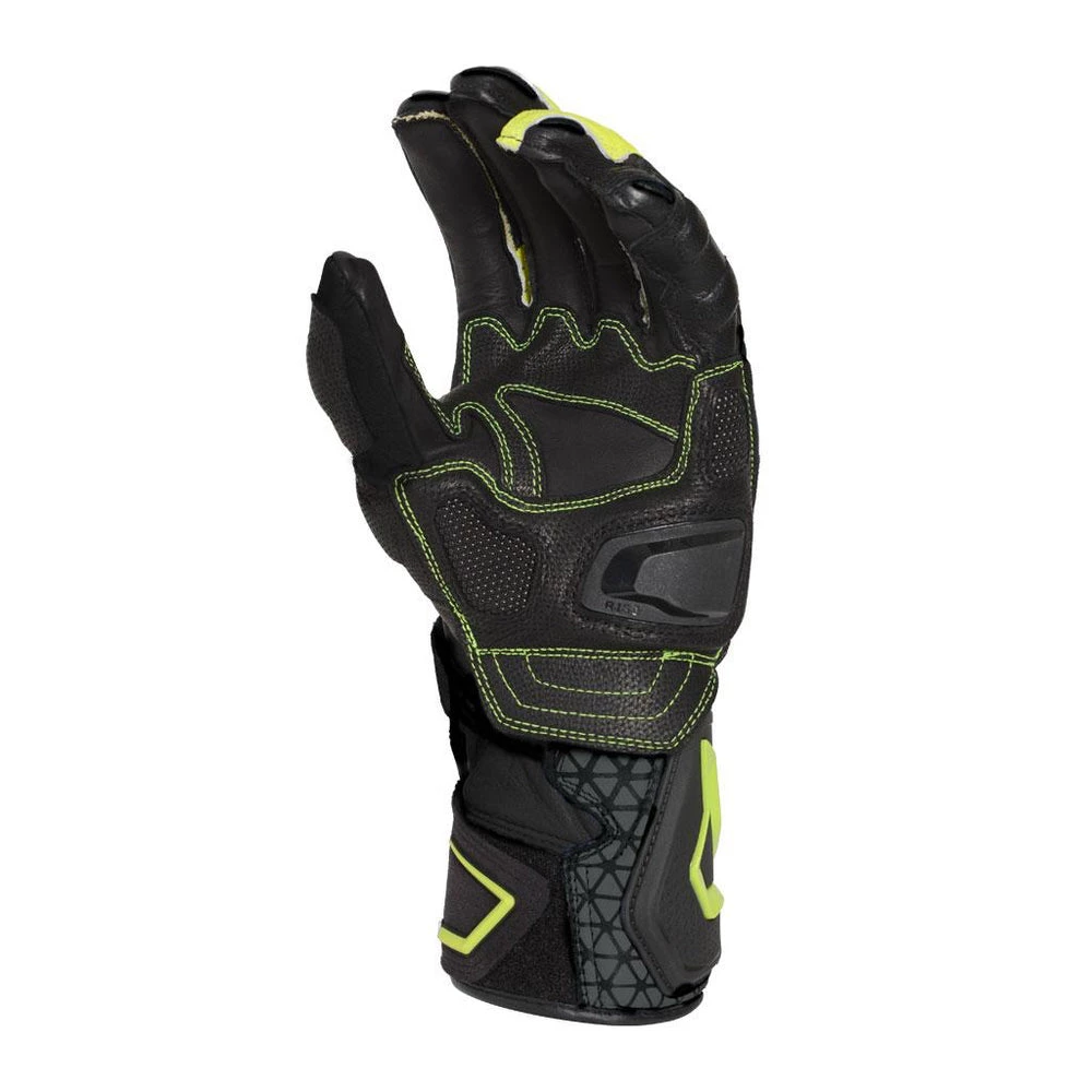 Safety: Carbon knuckle protection with fingers, knuckles and palms protected by R.I.S.C. Polyurethane injection moulded external protective parts, with the palm and side areas enjoying the additional protection of double layer Super Fabric plus a double Velcro closure system. One of the most commonly injured parts of the hand in road racing and sports riding accidents are the little fingers and Macna has joined the glove’s little finger to the ring finger for additional strength and protection in the event of a crash.